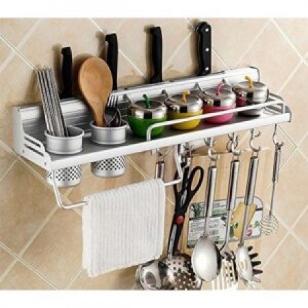 Main Rack: 58 x 12.5 x 10.5cm / 22.8 x 4.9 x 4.1” (L x W x H) Material: Space SS + Plastic, Surface: Matte Finishing Shelf for storing cups, tableware, spices, condiments, cans and jars 10 Hooks for hanging cook utensils like pots, pans, and dish towels 4 Knife slots for storing knifes, such as kitchen knife and fruit knife